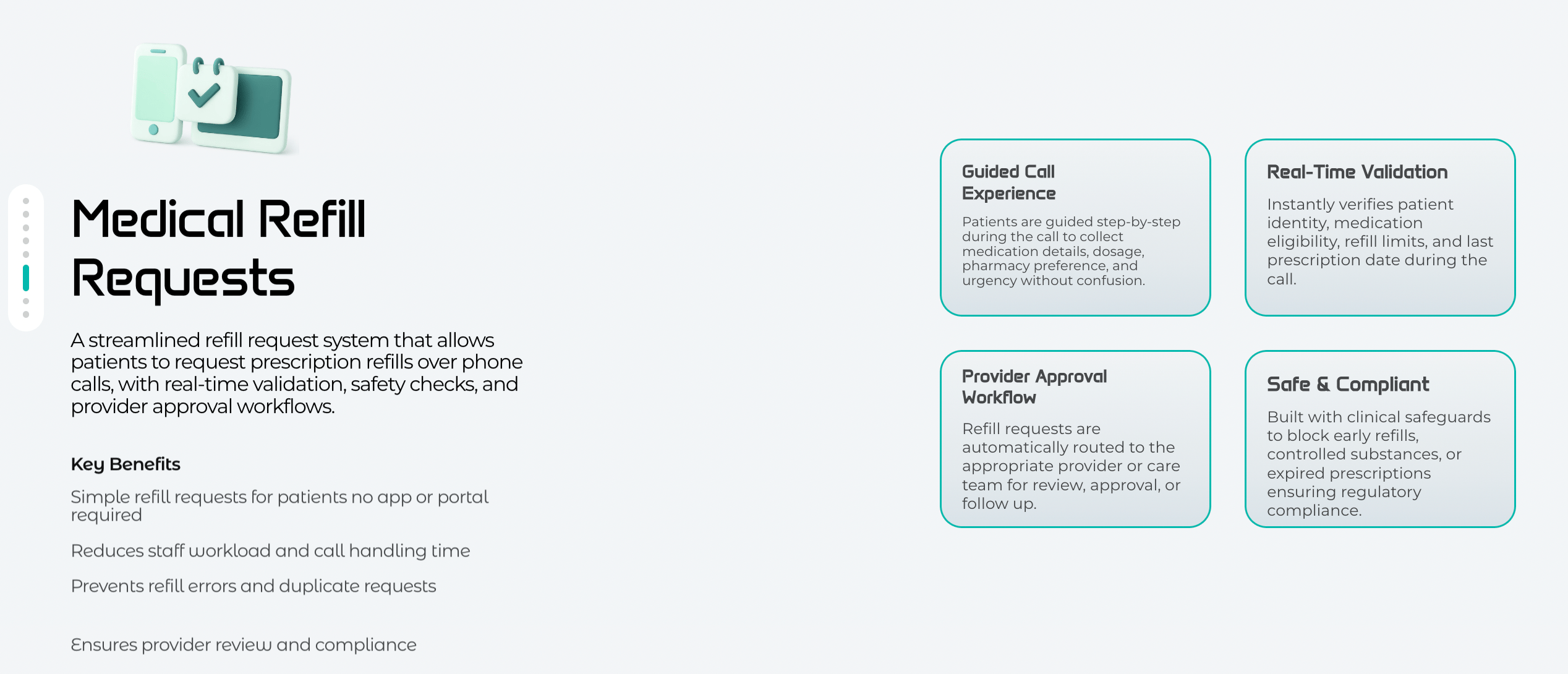 The platform uses AI-powered voice and SMS to manage medication refill requests, allowing patients to request refills through automated interactions rather than phone calls. The system also sends reminders, tracks refill-related outcomes, and helps reduce missed doses while lowering staff workload. By integrating with existing EHR systems, the tool enables clinics to handle high volumes of refill requests more efficiently without disrupting existing workflows.
