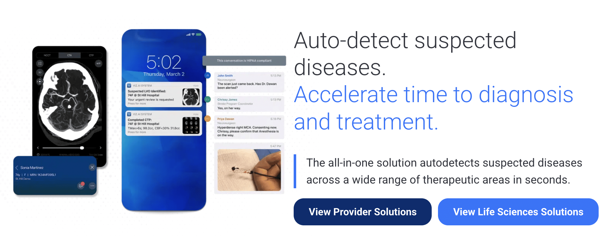 Viz.ai is an FDA-cleared AI platform designed to rapidly detect and triage conditions such as stroke, pulmonary embolism, and aortic disease using medical imaging. The system uses deep learning algorithms to automatically analyze CT scans and notify appropriate specialists within minutes when a suspected abnormality is detected. By integrating directly into hospital workflows, Viz.ai reduces time to diagnosis and treatment, particularly in time-sensitive conditions like large vessel occlusion stroke, where minutes can significantly impact neurological outcomes. The platform is now used in hundreds of hospitals and has been shown to reduce door-to-treatment times and improve care coordination across multidisciplinary teams.