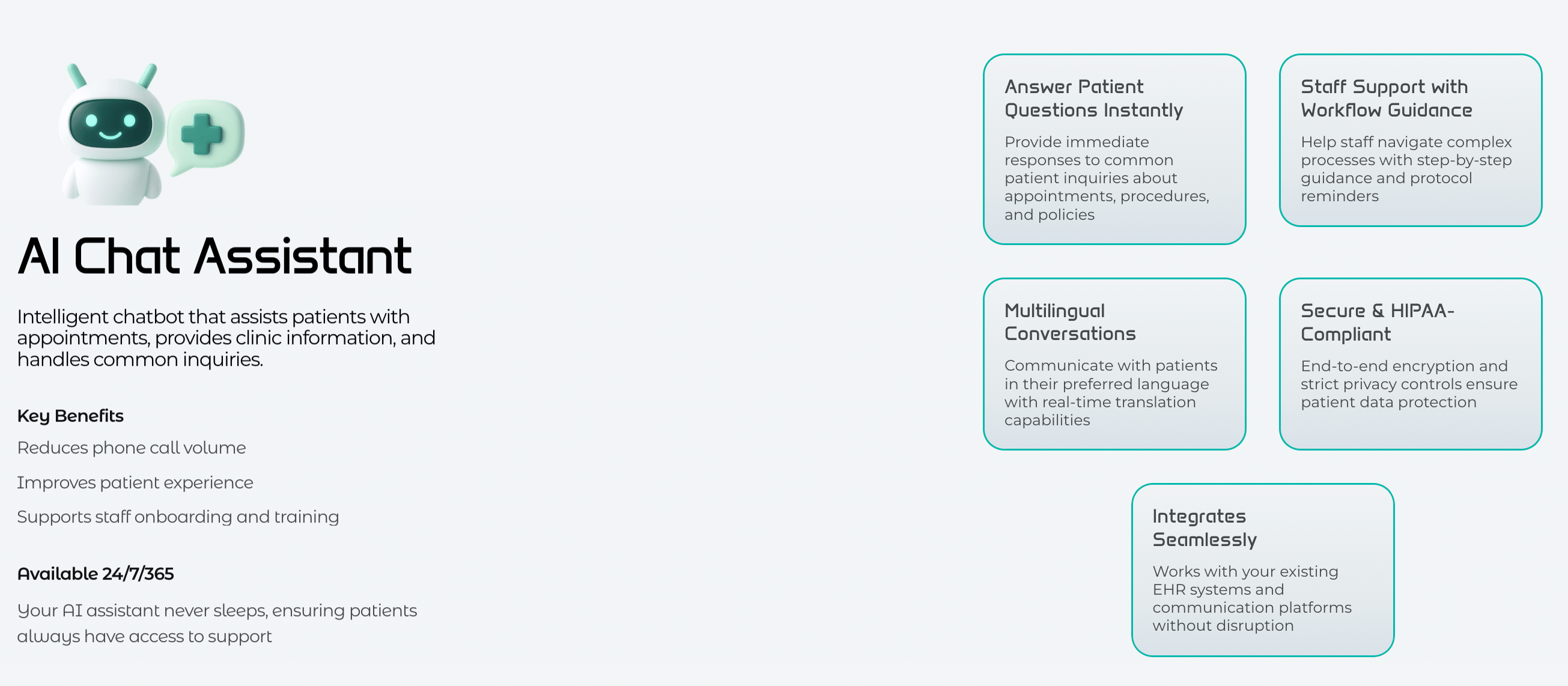 The product answers patient calls, schedules, reschedules, and cancels appointments, sends reminders, verifies insurance eligibility before visits, and follows up with patients on unpaid balances via voice and SMS, reducing missed calls, no-shows, and delayed collections.